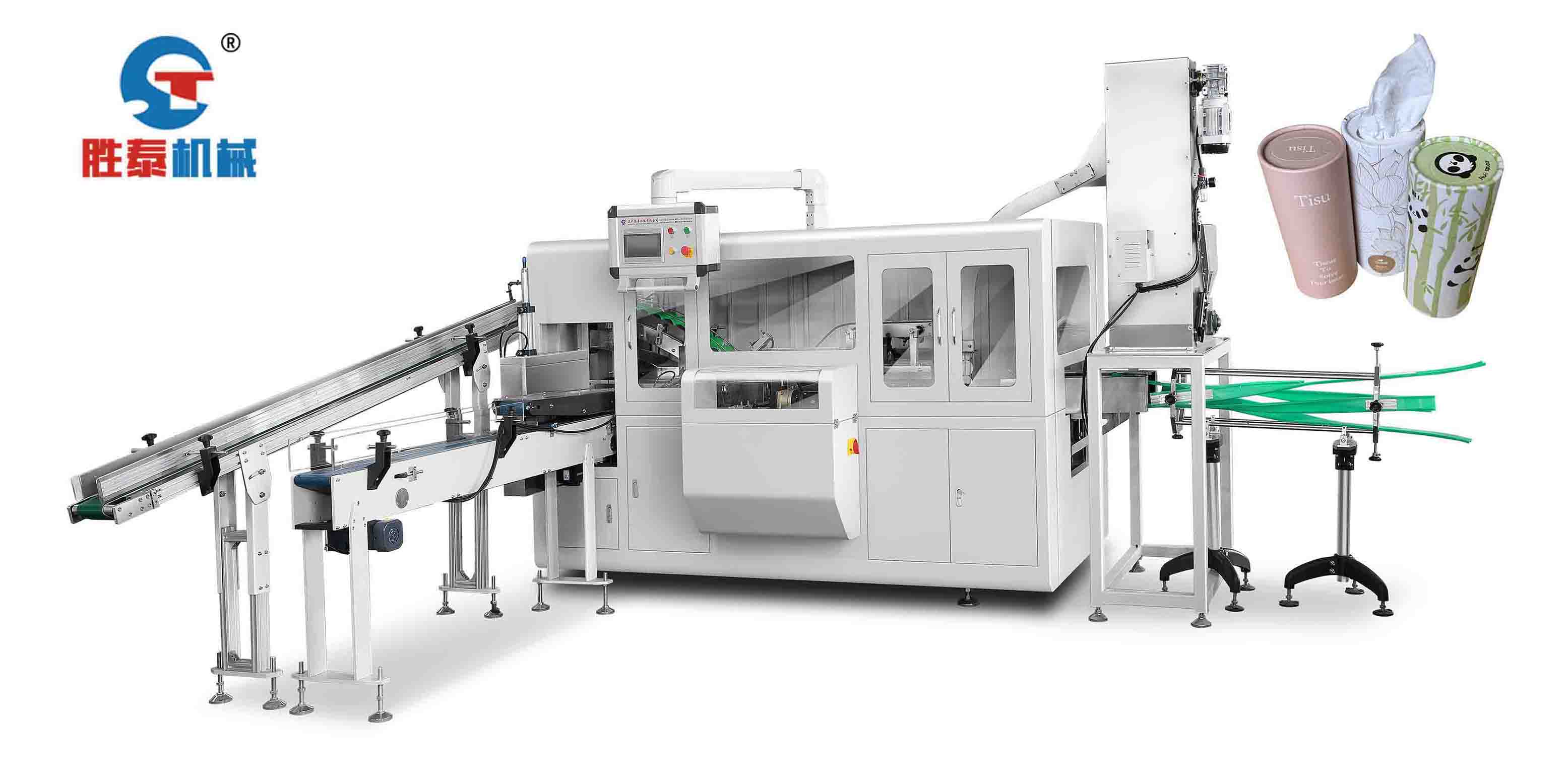 Full-automatic cylindrical car-mounted paper towel packaging machine is applicable to the product packaging of various cylindrical packaging boxes, and can be used for tea packaging, paper towel packaging, food packaging, bagged strip and other product packaging. The outer packaging cylinder of the equipment automatically conveys and unloads materials, and the materials are fed and output, which can be matched with the capping equipment.